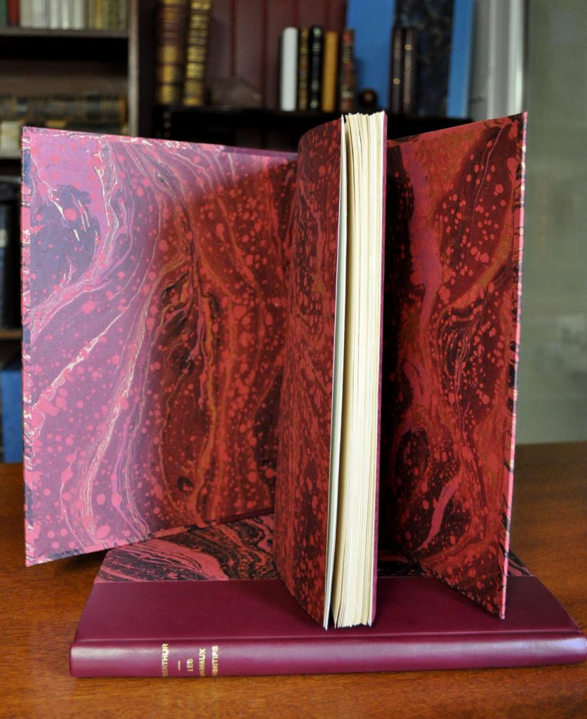 Demi-cuir de basane violet sombre, plats papier mécanique magma...
